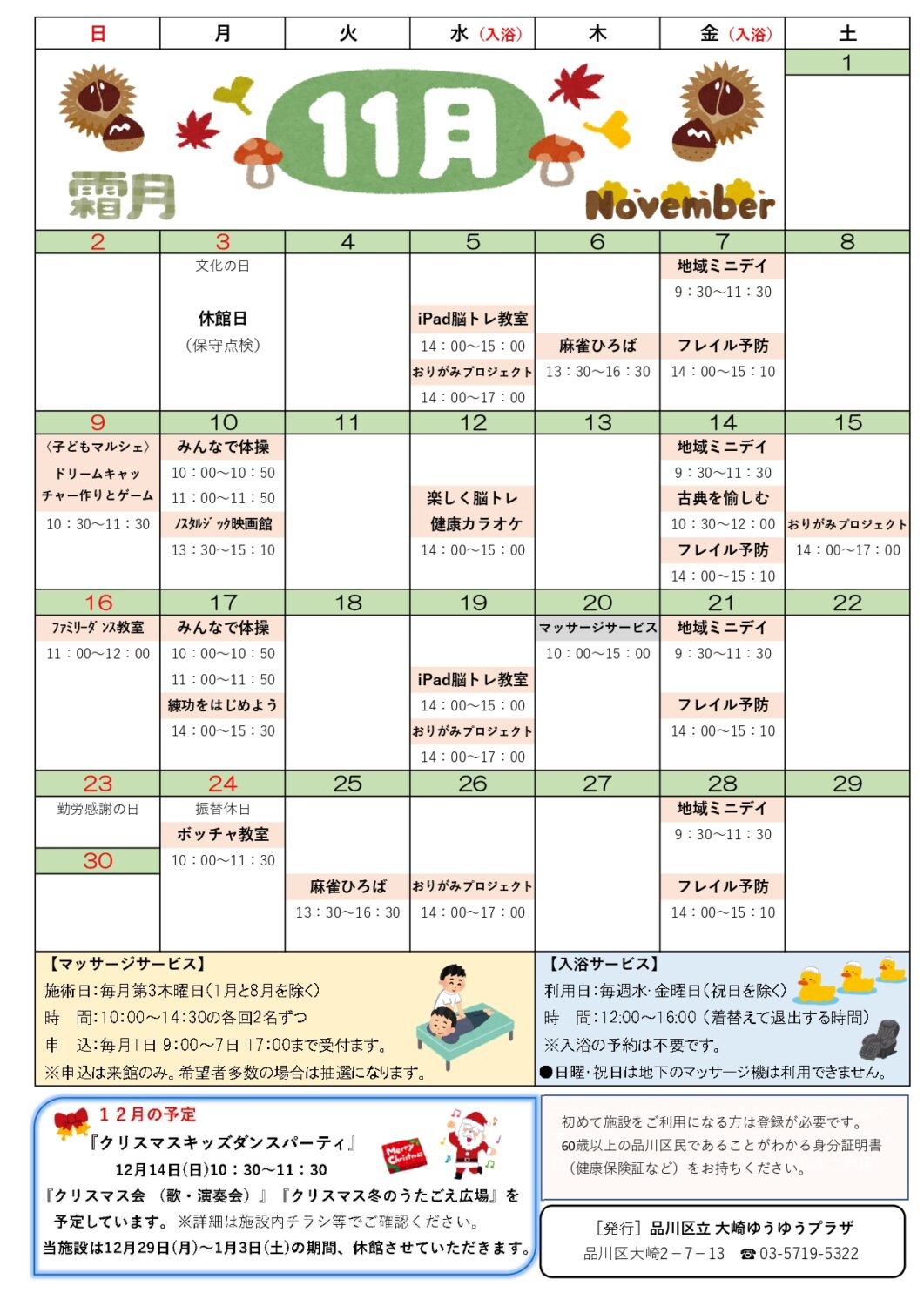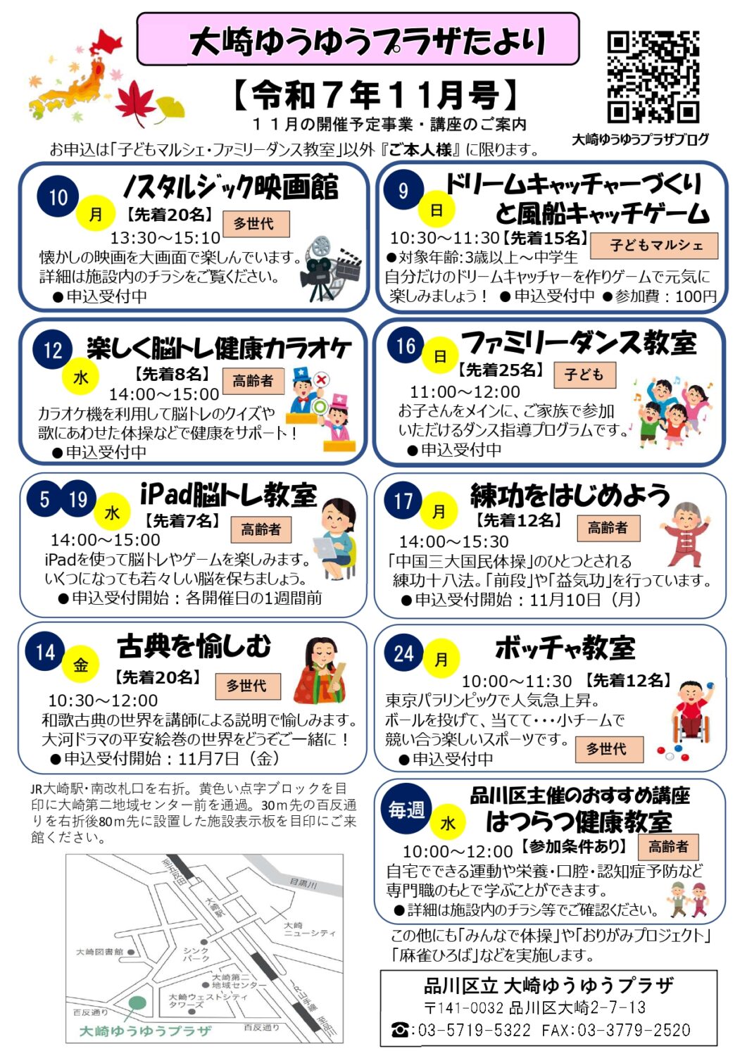 11月の「大崎ゆうゆうプラザだより」、詳細は下記をご覧ください。
