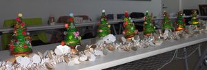 クリアファイルでつくった円すいに、緑の毛糸を巻きつけていきます。幹の部分は茶色。ツリー部分の飾りは、好きな色や飾りを自由に選んで・・それぞれ違った個性豊かな作品が仕上がりました。