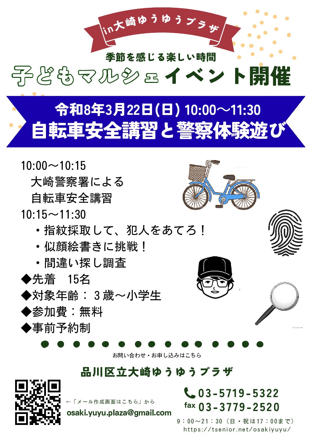 春の兆しを感じつつ季節の変わり目、体調管理にも気を配る時期。4月からは自転車の交通違反ルール改正など、生活にも変化が・・・。3月の子どもマルシェは「自転車安全講習と警察体験遊び」です。詳細は下記をご覧ください。